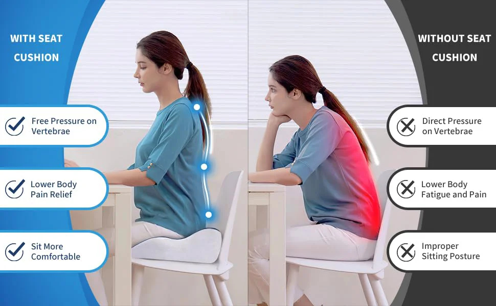 Experience all-day comfort: Sitting for long hours can be uncomfortable, but our seat cushion provides relief from pressure points, allowing you to focus on your work without distractions.