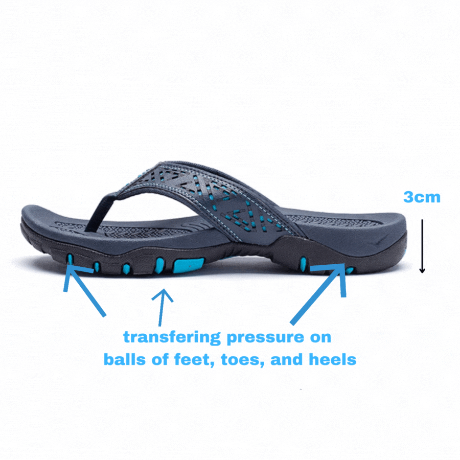 Arch Support: With a 3cm thickness in the sole, the sandal transfers body weight effectively on your heels, and even your balls of feet as well as your toes. Furthermore, it absorbs shock well when you hit the ground, therefore,  reducing pain and fatigue when standing all day long.